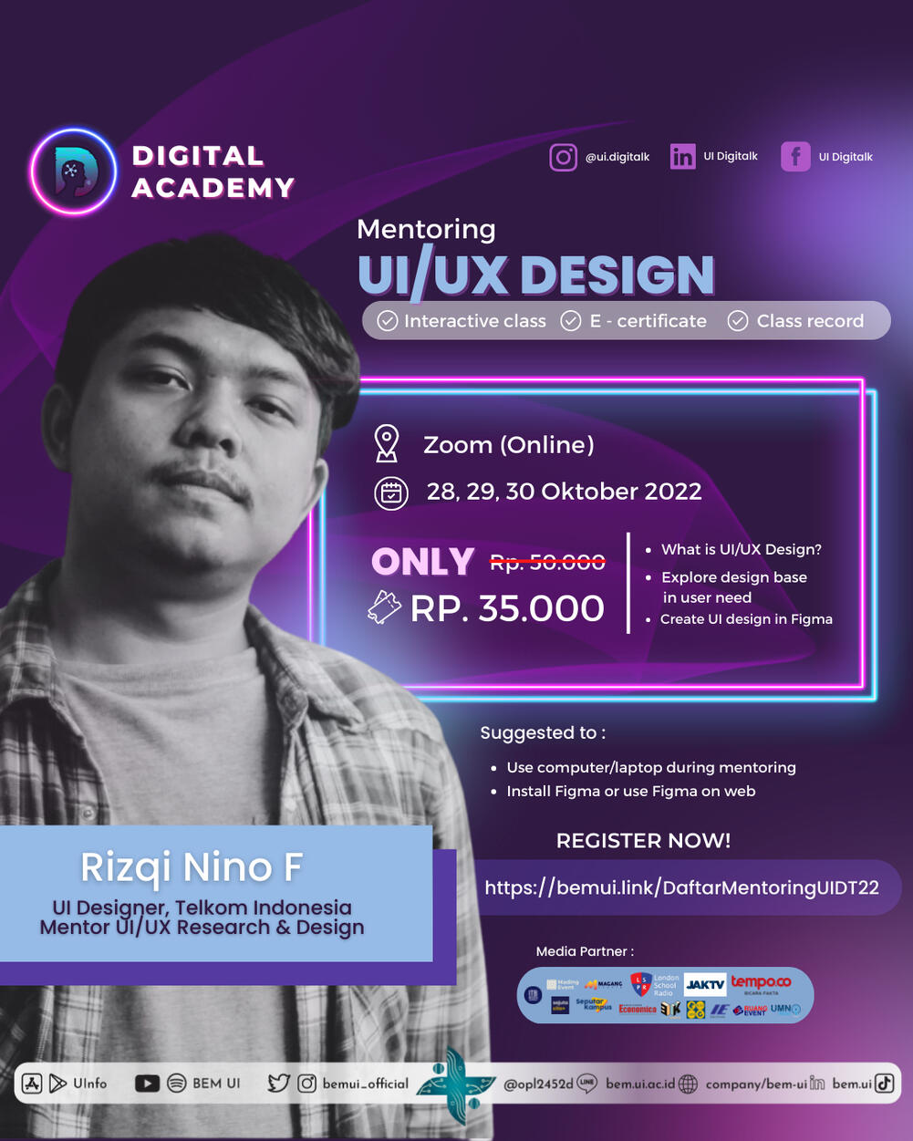 Improve your digital skill with us : Get to know about UI/UX Design, Explore design base in user need, Create UI design in Figma